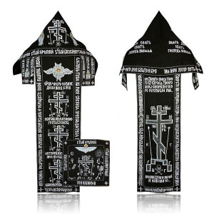 y está bordado con los instrumentos de la Pasión y el Trisagio. La forma griega no tiene una capucha, la forma eslava tiene una capucha y orejeras en los hombros, por lo que la prenda se forma una gran cruz que cubre del monje hombros, el pecho y la espalda. Otra pieza añadida es la Polystavrion (Πολυσταύριον, "Muchas Cruces"), que consiste en un cable con una serie de pequeños cruces trenzados en ella. El polystavrion forma un yugo alrededor del monje y servirá para fijar las analavos en su lugar, y recuerda al monástica que él está obligado a Cristo y que sus brazos ya no son aptos para las actividades mundanas, sino que debe trabajar sólo para el Reino de los Cielos. Entre los griegos, se añade el manto en esta etapa.