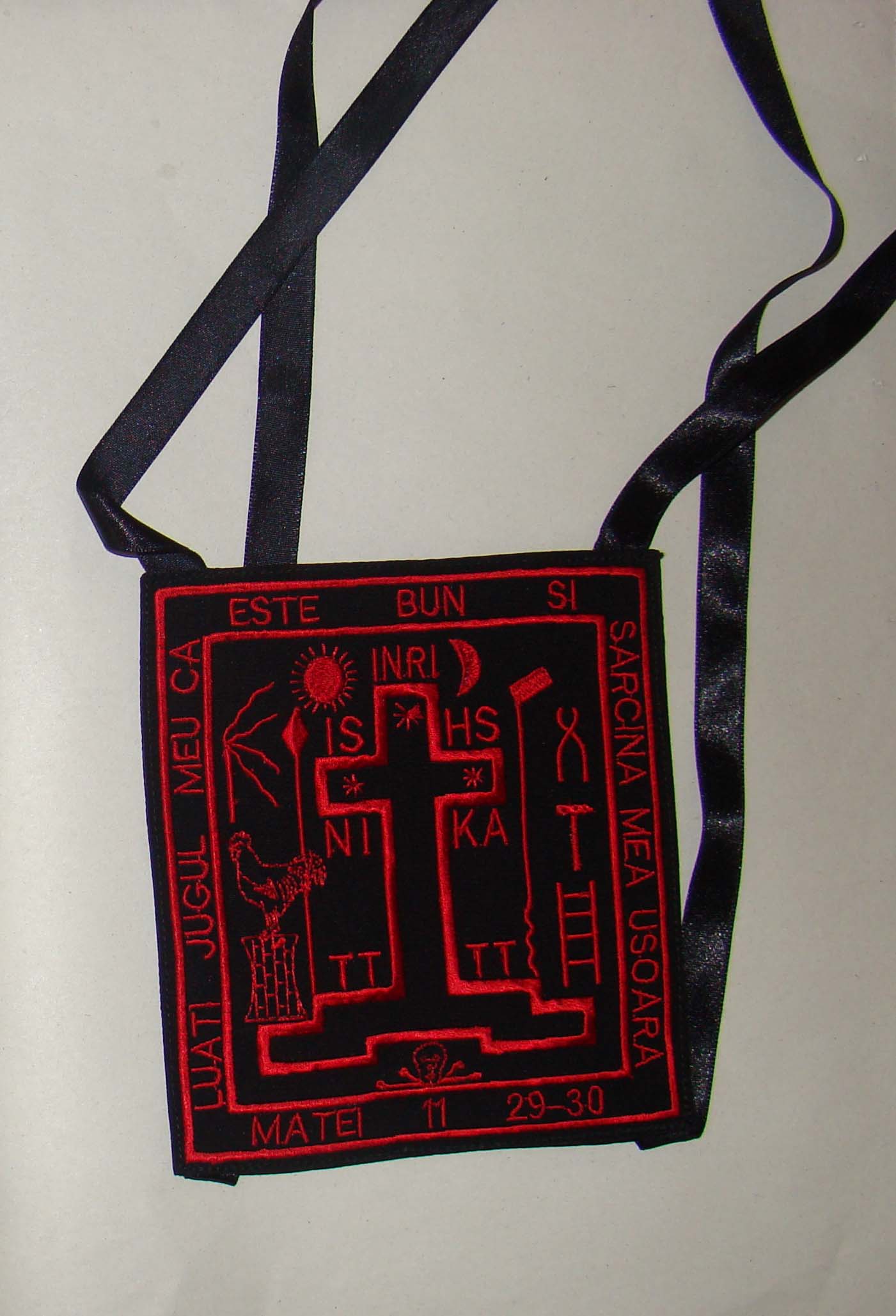 Cuerdas negro de lana tejida cruzaron varias veces. Ambos modelos Traen el hábito, en los hombros, los cuales son descendientes de cruzar entre sí en el pecho y en los hombros.