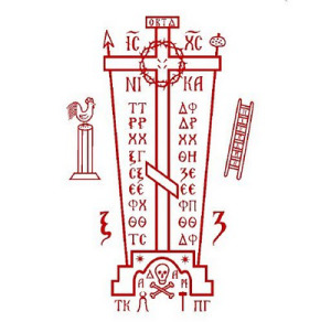 Las letras griegas que aparecen en las analavos son abreviaturas de frases que ensalzan la Cruz como "el poder de Dios" (I Corintios 01:18). De arriba a abajo: